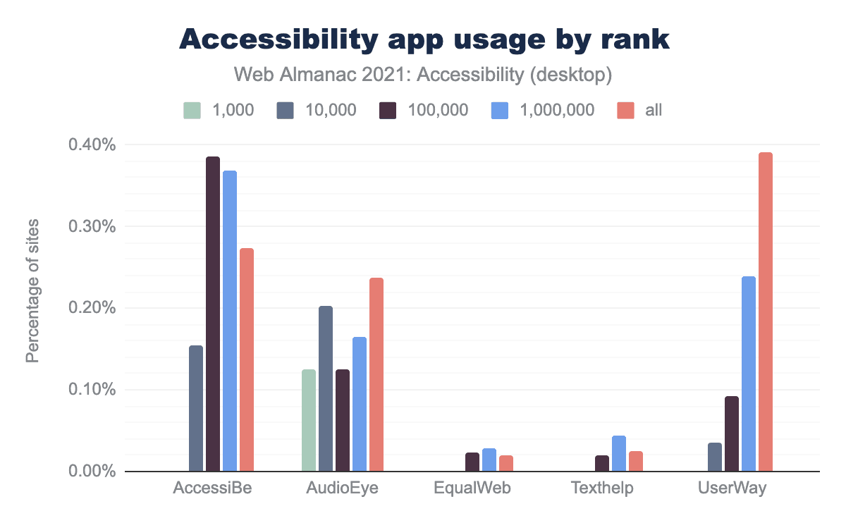 その結果、デスクトップWebサイトの0.96%(6万件以上)で、これらのアクセシビリティ・オーバーレイが使用されていることがわかりました。この分野の有名な製品のリストを照会したことは、注目に値します。しかし、このリストは網羅的なものでないので、この指標は実際にはもっと高い可能性があります。