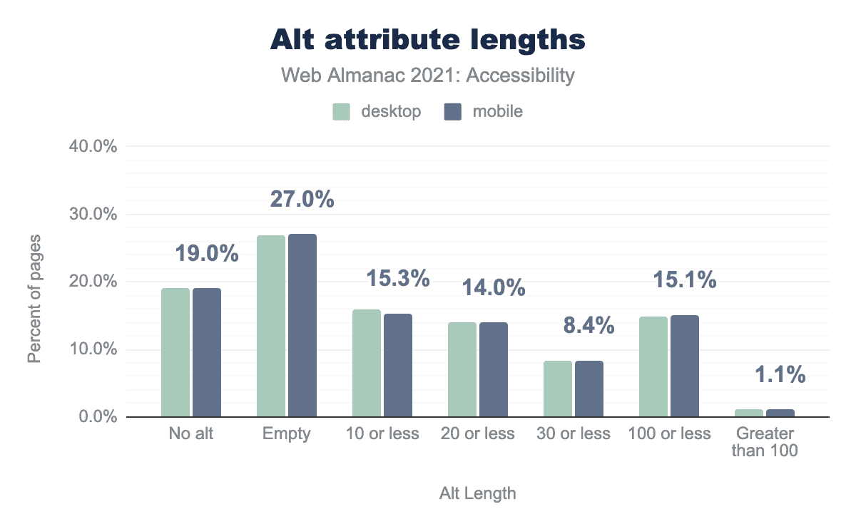 altが設定されておらず、それぞれ26.9%と27.0%で空になっており、15.9%と15.3%で10文字以内、13.9%と14.0%で20文字以内、8.2%と8.4%で30文字以内、14.8%と15.1%で100文字以内、そして1.1%と1.1%で100文字超になることが示されています。alt 属性の長さ。