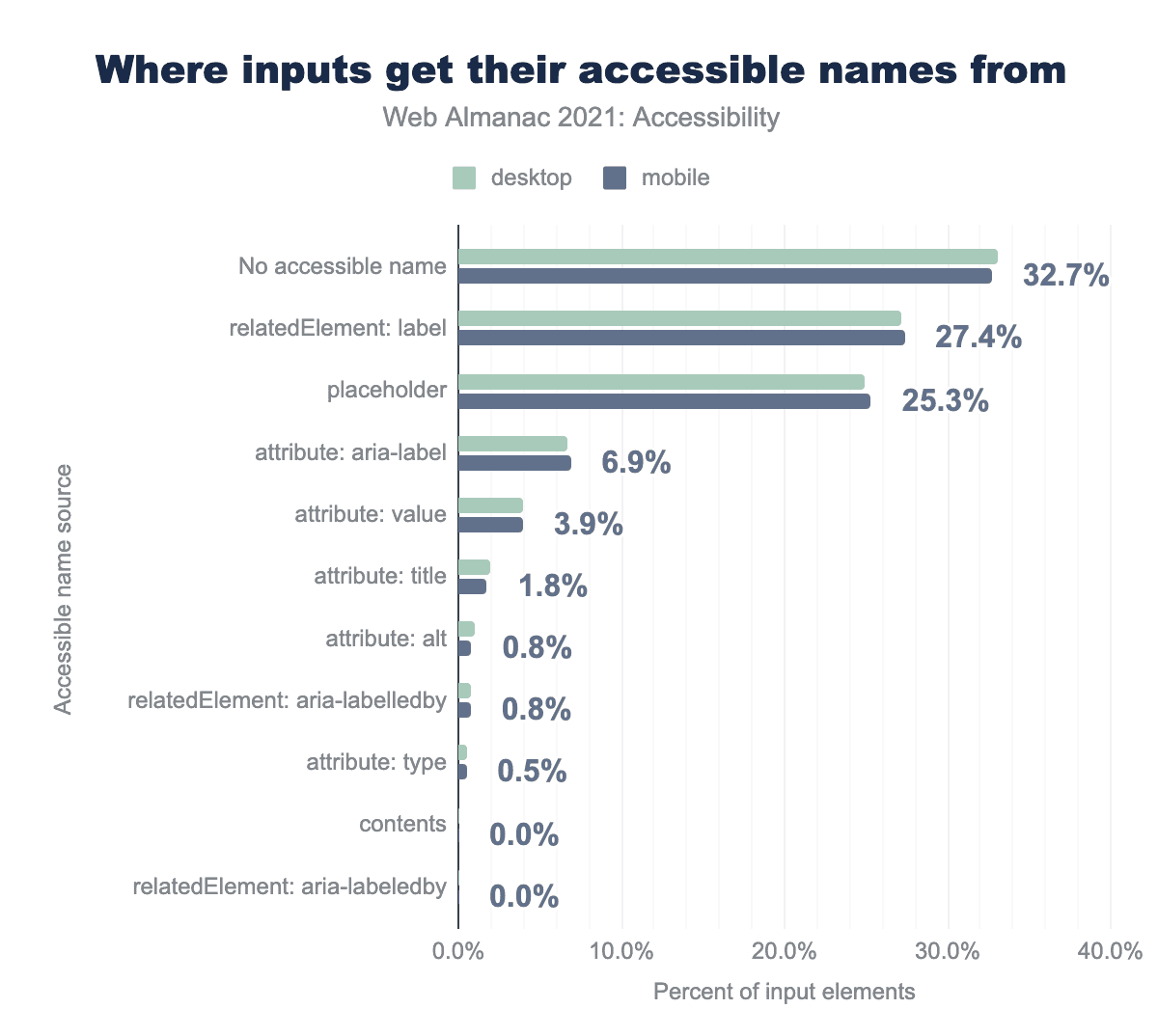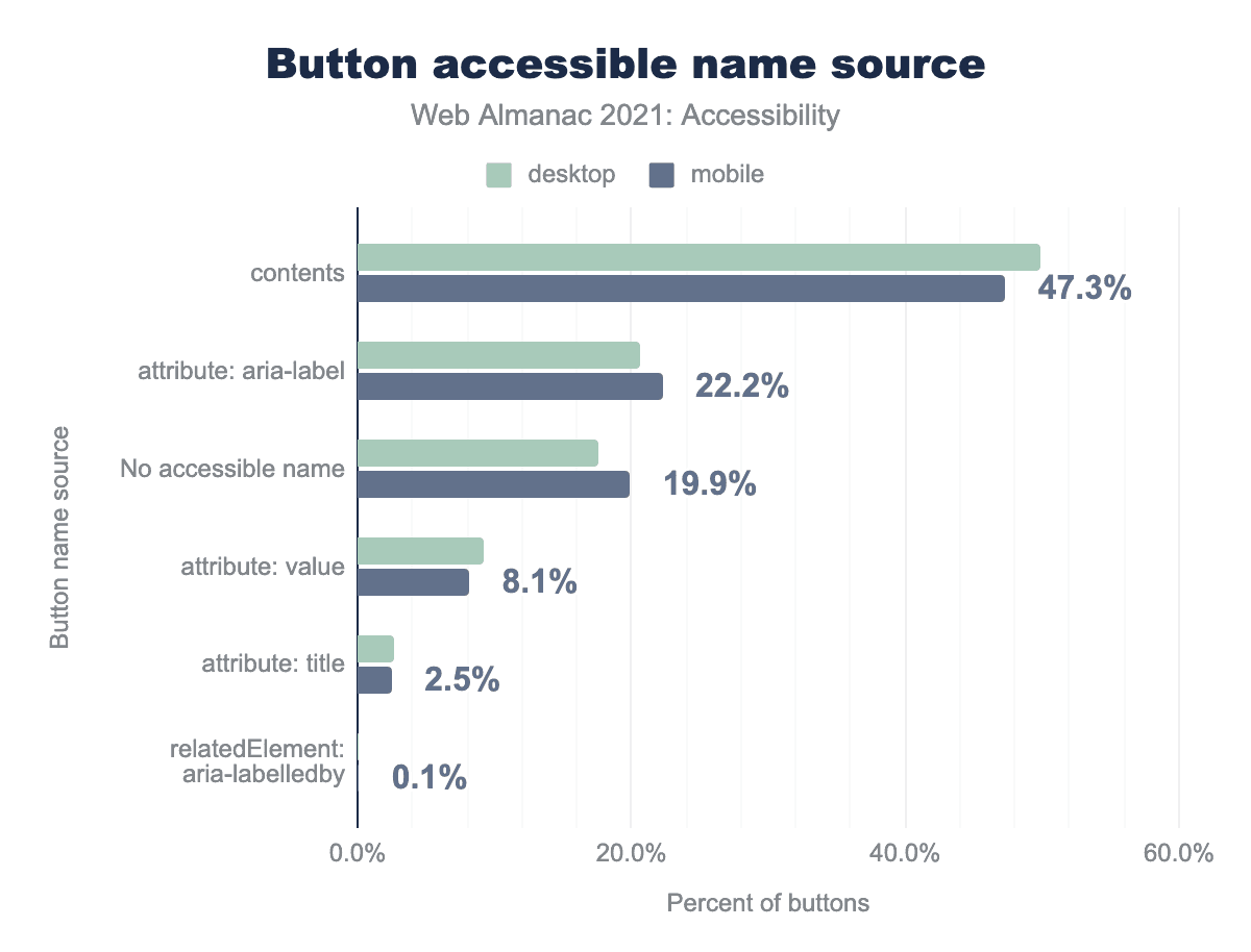 aria-label 属性が使用され、17.5%と19.9%にアクセス可能な名前が存在せずvalue 属性は 9.2% と 8.1%、 title 属性が 2.6% と 2.5%、 aria-labelledby 関連要素が 0.1% と 0.1% で使用されたことを表します。その結果、デスクトップとモバイルの両サイトにおいて、57%のボタンがコンテンツからアクセシブルネームを取得していることがわかりました。また、デスクトップサイトでは29%、モバイルサイトで27%のボタンが aria-label 属性からアクセシブルネームを取得していることがわかりました。