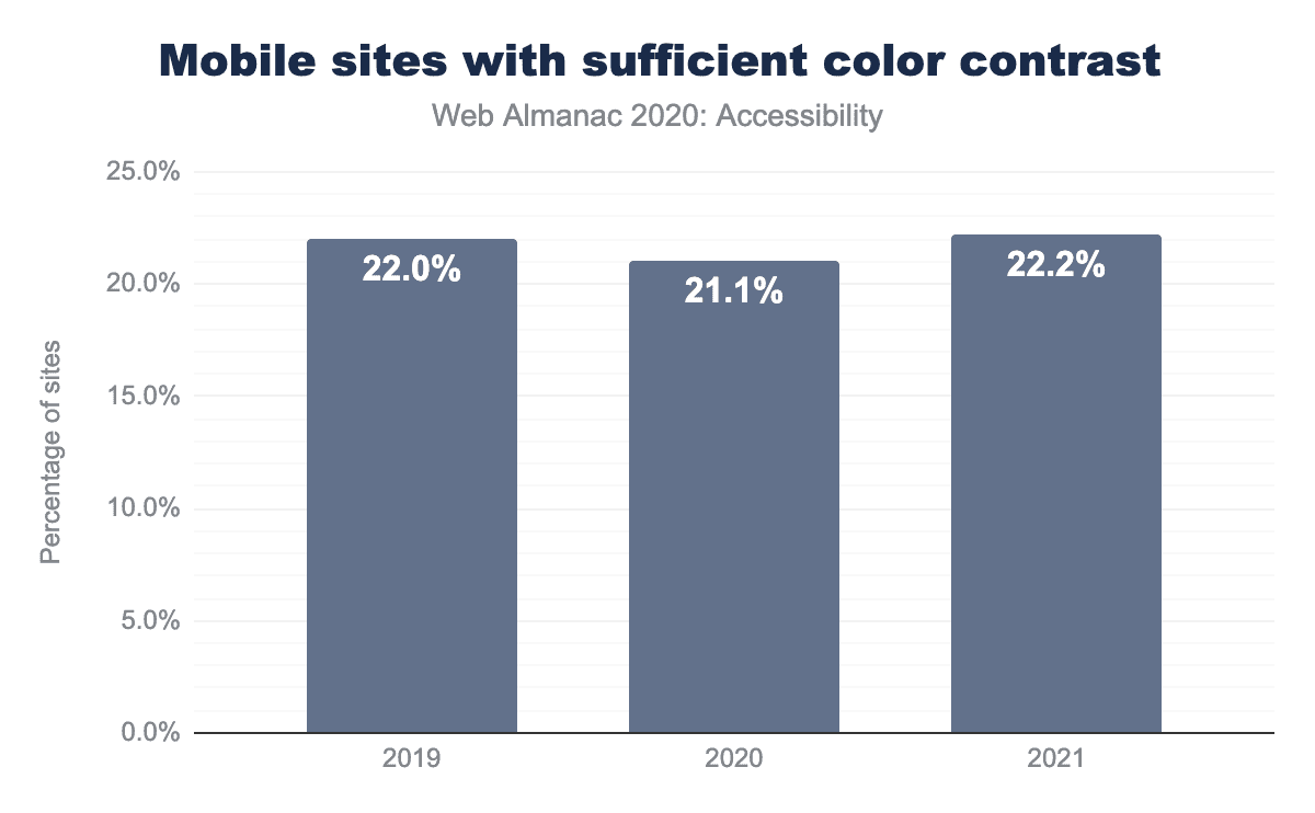 今年、Lighthouseでカラーコントラストのスコアが合格だったサイトは、わずか22%であることがわかりました。非テキストコンテンツは非常に多様であるため、これらのスキャンはテキストベースのコントラストの問題しか捉えることができないことは注目に値します。このスコアは前年とほぼ同じで、2020年は21%、2019年は22%でした。テキストベースのコントラストの問題をキャッチすることは、一般的なさまざまな自動化ツールで可能であるため、この指標はややがっかりさせられるものです。