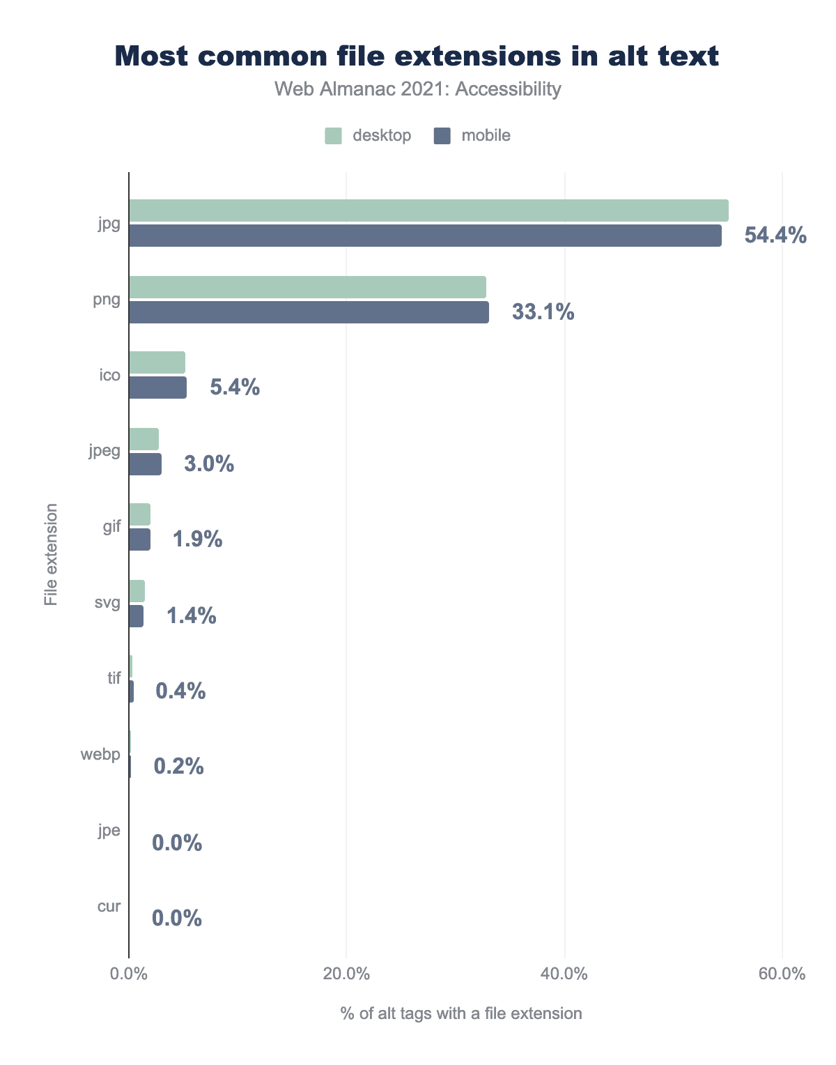 jpg55.1%、モバイルサイトで54.44%、png32.8%、33.11%、icoが5.2%、5.36%、jpegは2.8%と3.00%、gifは2.0%と1.92%、svgは1.5%と1.36%、tifは0.3%と0.38%、webpは0.2%と0.21%、jpeは0.0%、そして最後に cur は 0.0%と 0.03% であることがわかりました。alt テキストで表示します。