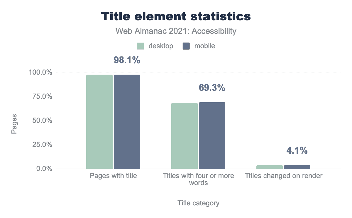 <title>要素を使用しており、そのうちの68.5%、69.3%が4文字以上のタイトルで、レンダリング時に変更されるのはデスクトップ、モバイルともに4.1%という棒グラフが示されています。当社のデータでは、98%のウェブページにタイトルがあります。しかし、そのうち4語以上のタイトルを持つページは68%に過ぎず、かなりの割合のウェブページが、ページの内容に関する十分な情報を提供するユニークで意味のあるタイトルを持っていない可能性があります。