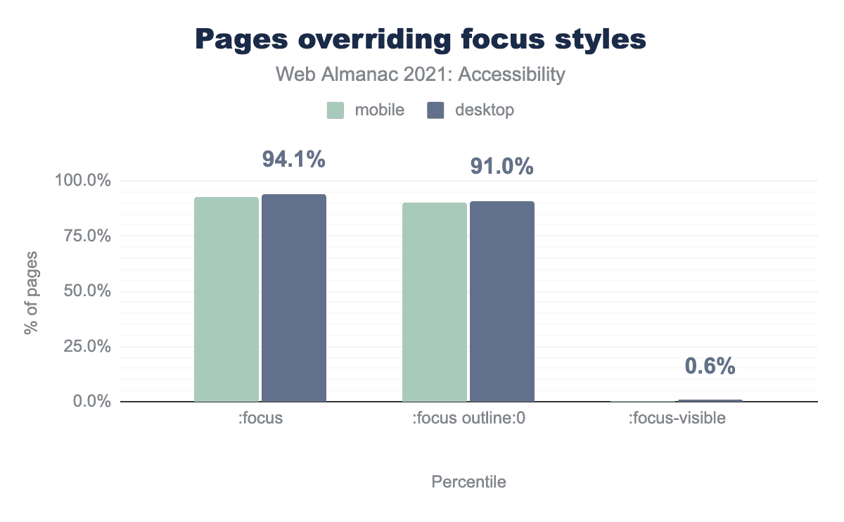 :focus 擬似クラスを使用しており、デスクトップサイトの90.0%、モバイルサイトの91.0%がその :focus 擬似クラスを使ってアウトラインを0またはゼロに設定しているという棒グラフです。デスクトップサイトの0.6%、モバイルサイトの0.6%は :focus-visible 疑似クラスを使用しています。ボタンやフォームコントロール、リンクなどのインタラクティブなコンテンツでは、CSSプロパティ :focus { outline: none; } や :focus { outline: 0; } を用いて、時には :focus-within や :focus-visible と共に、デフォルトのフォーカス表示を解除することがよくあります。デスクトップページの91%に:focus { outline: 0; }が宣言されていることがわかりました。場合によっては、より効果的なカスタムスタイルを適用できるように、この宣言は削除されます。残念ながら、多くの場合、単に削除されただけで置き換えられることはなく、キーボード・ユーザーにとって使い勝手の悪いページになってしまいます。