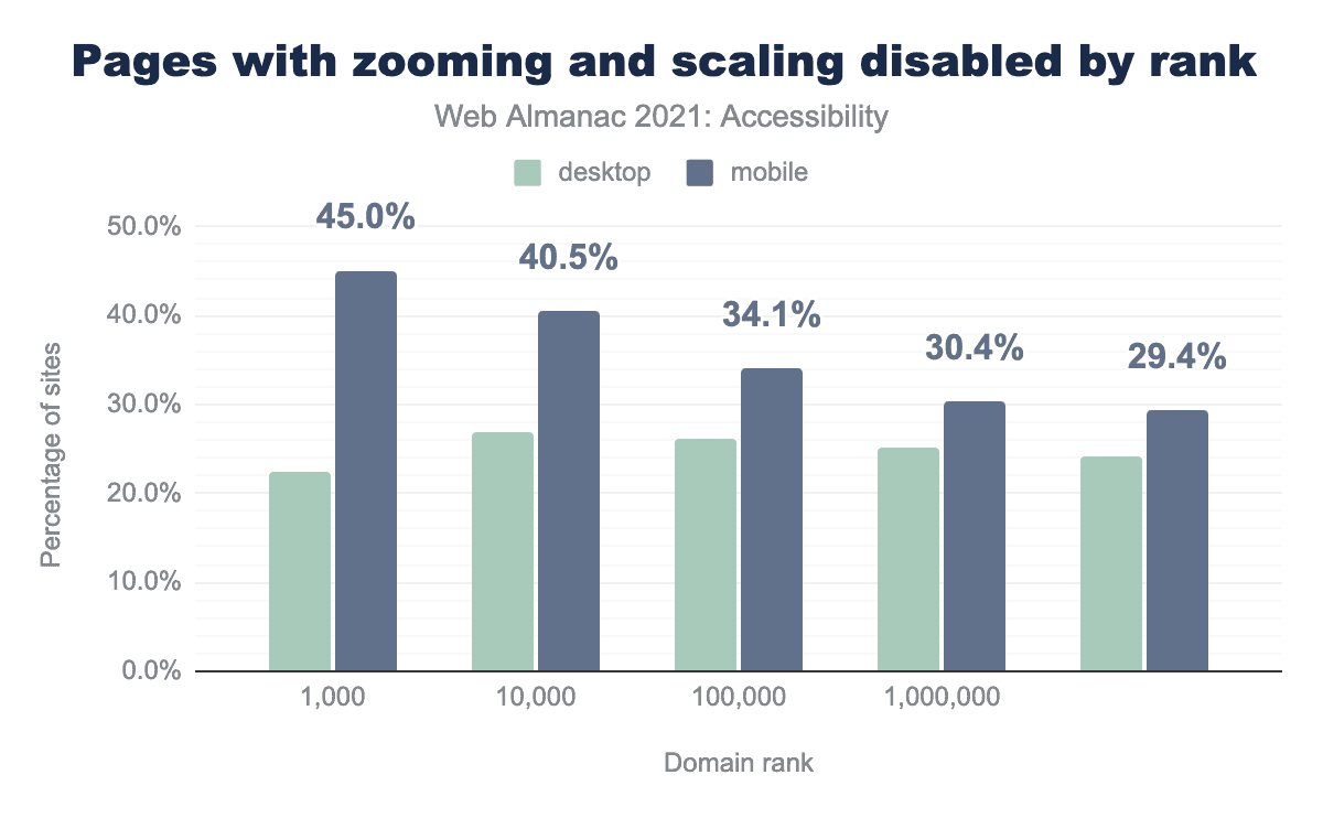 デスクトップ用ホームページの24%とモバイル用ホームページの29%が、maximum-scaleを1以下に設定するか、user-scalableを0またはnoneに設定して、スケーリングを無効にしようとしていることがわかりました。