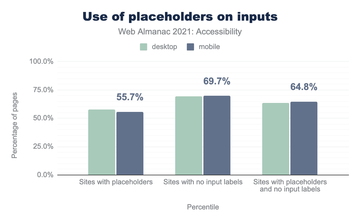 要素のセマンティクスを削除するということは、その要素の動作や支援技術による理解の観点から、その要素はもはやその要素ではなく、その視覚的な外観だけが残るということを意味します。たとえば、role="presentation"を持つリストは、リストの構造に関する情報をスクリーン・リーダーに伝えることができなくなります。デスクトップ・ページの22%とモバイル・ページの21%に、少なくとも1つの要素が role="presentation" を持つことがわかりました。このロールが支援技術利用者にとってとくに役立つユースケースは非常に少ないので、控えめに、そして慎重に使用してください。