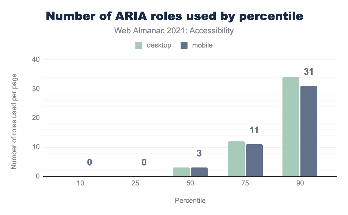 デスクトップサイトの29%(2020年の25%から増加)とモバイルサイトの29%(2020年の25%から増加)が、明示的に割り当てられた role="button" の要素を少なくとも1つ持つホームページを持っていることがわかりました。このことから3分の1近くのウェブサイトが、明示的にボタンの役割を割り当てられたボタンを除いて、セマンティクスを変更するため要素に button の役割を使用しており、これは冗長であることがわかります。