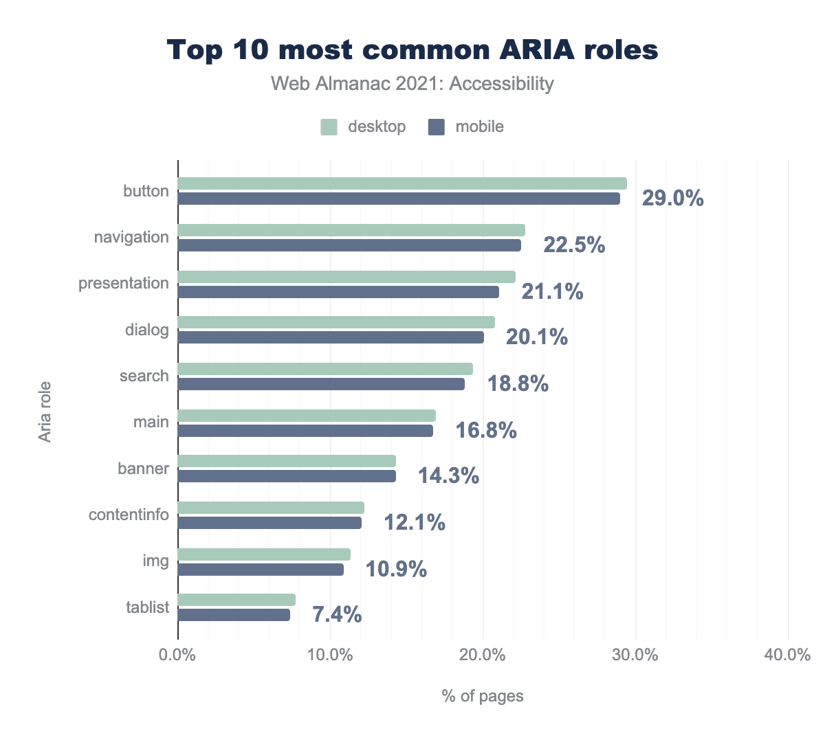 buttonがデスクトップで29.4%、モバイルでは29.0%、navigationが22.8%、22.5%、presentation22.2%、21.1%、dialog20.8%、20.1%、search19.3%と18.8%、mainが16.9%と16.8%、bannerが14.3%と14.3%、contentinfoが12.2%と12.1%、imgが11.4%と10.9%、最後のtablistは7.7%と7.4%であった。ボタンを使うだけ!