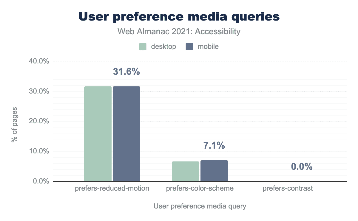 prefers-reduced-motion は、ウェブ制作者がウェブページ上のアニメーションやその他の動きのあるソースを通常はコンテンツを削除したり、置き換えたりして、より静的な体験へ置き換えるために使用します。 これは、画面上の速い動きによって注意力が散漫になったり、その他の誘因を受けたりするさまざまな人々を助けることができます。32%のウェブサイトが prefers-reduced-motion メディアクエリを使用していることがわかりました。