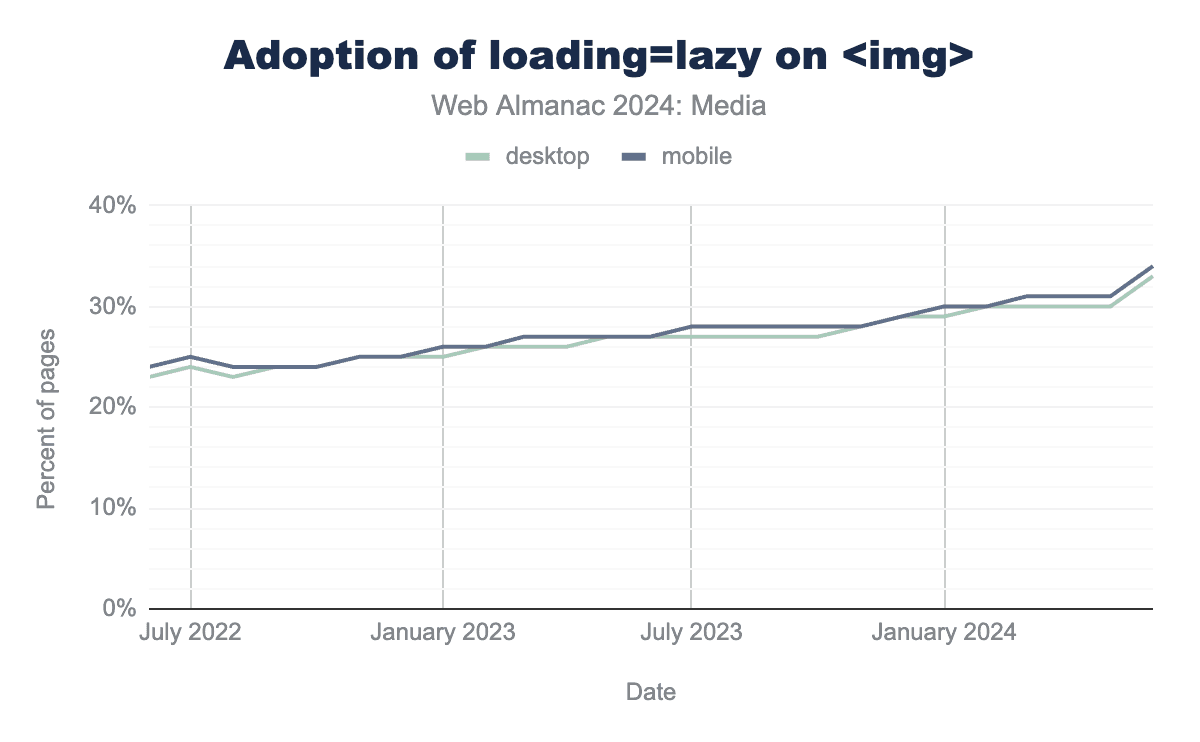 ウェブサイトに画像が埋め込まれる方法における最近の最大の変化は、遅延読み込みの急速な採用でした。遅延読み込みは2020年に導入され、わずか2年後にはほぼ4分の1のウェブサイトで採用されました。その上昇は続き、現在ではすべてのウェブサイトの完全に3分の1で使用されています: