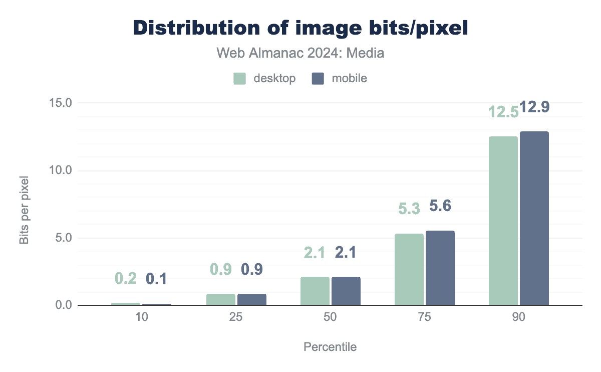 中央値の画像はピクセルあたり2.1ビットに圧縮されており、これは1990年代の経験則よりも少し多い圧縮を表しています。これはまた、2022年に最後にウェブの画像を調査したときに見た圧縮率よりも8〜10%多い圧縮です。