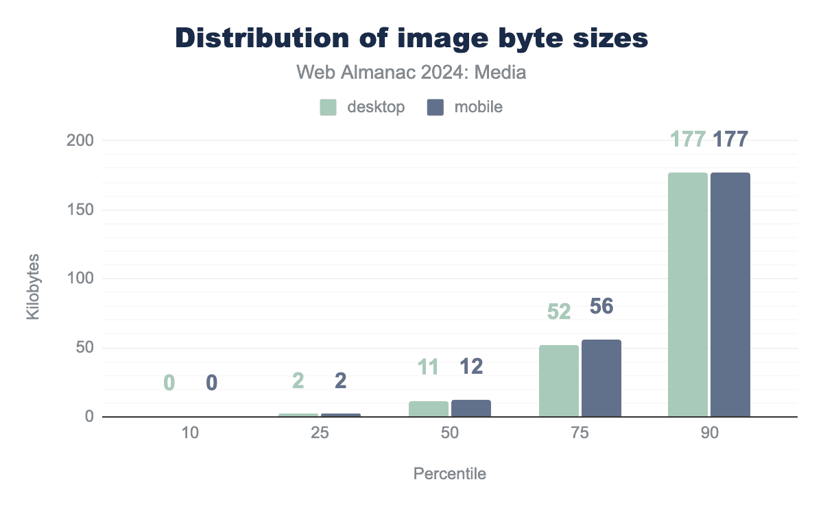 おそらく驚くことではありませんが、ウェブ上の画像はより大きくなっていることがわかりました。画像のピクセル数やレイアウトの寸法のどちらを数えても、数値は上昇しています。そのため、圧縮率の向上(一部は最新の画像フォーマットの採用増加による)にもかかわらず、画像の合計バイトサイズも増加しています。