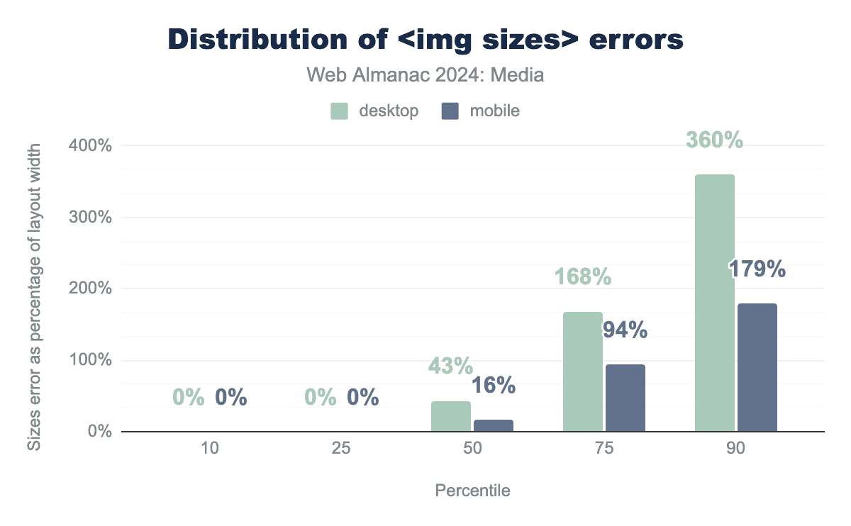 sizes属性の相対的なエラーの分布を示す棒グラフ。最初はすべてゼロで、10パーセンタイルと25パーセンタイルではデスクトップとモバイルの両方で0%です。50パーセンタイルではデスクトップで43%、モバイルで16%、75パーセンタイルではそれぞれ168%と94%、そして90パーセンタイルではデスクトップで360%、モバイルで179%となっています。<img sizes>エラーの分布。