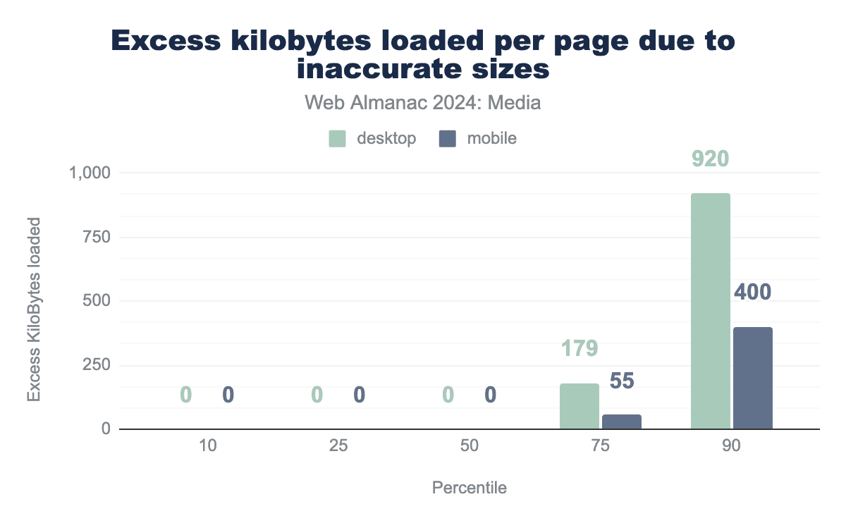 sizes属性によってページごとに無駄に読み込まれるキロバイトの分布を示す棒グラフ。最初はゼロばかりです。10パーセンタイル、25パーセンタイル、50パーセンタイルでは、モバイルとデスクトップの両方でゼロキロバイトです。75パーセンタイルでは、デスクトップクローラーは179キロバイト、モバイルでは55キロバイトの無駄を検出し、90パーセンタイルでは、デスクトップでは920キロバイト、モバイルでは400キロバイトでした。sizesによってページごとに読み込まれる余分なキロバイト。