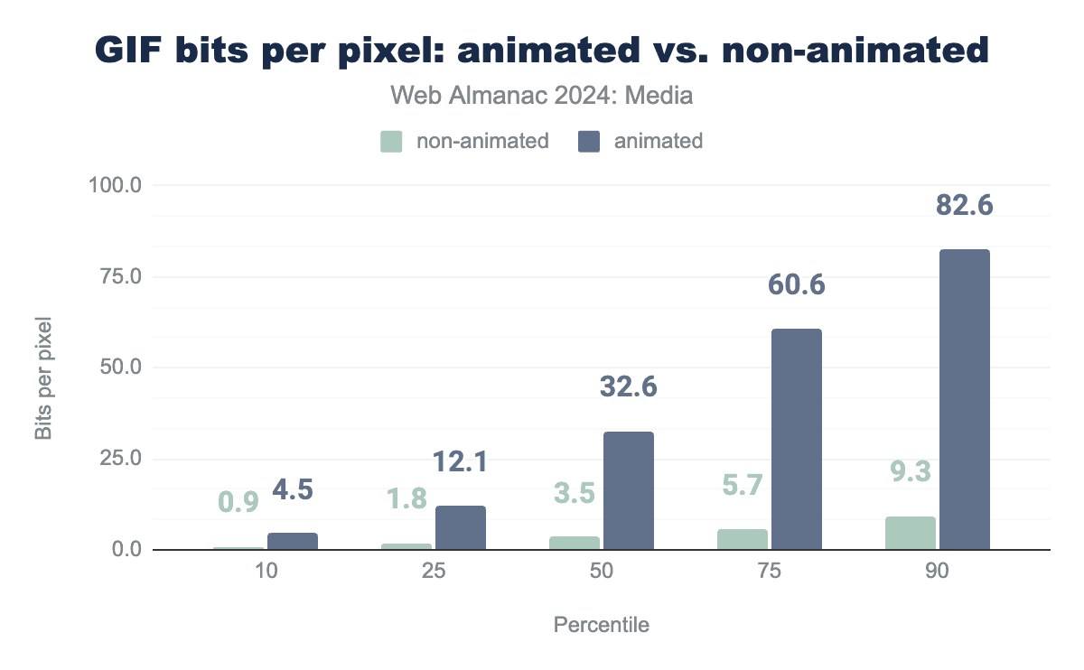 アニメーションGIFとアニメーションではないGIFを分けてみると、アニメーションではない中央値のGIFははるかに合理的に圧縮されていることがわかります:
