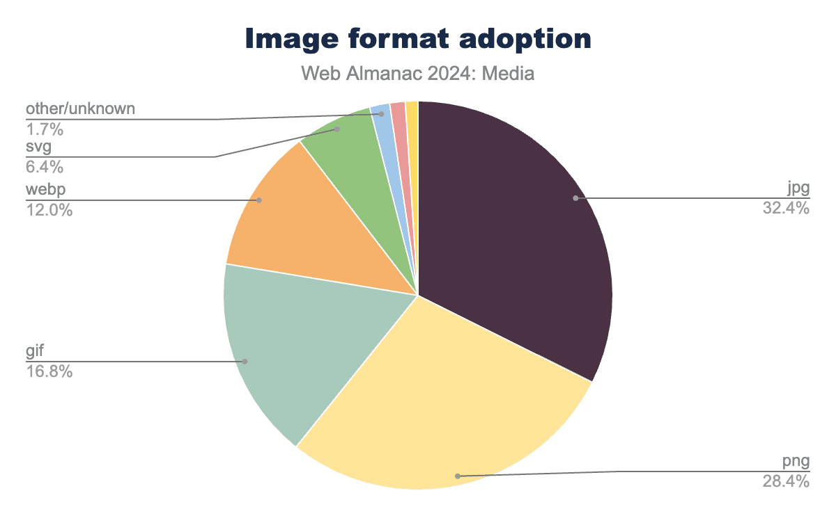 しかし、変化が起きていることを嬉しく報告できます。2022年以降の使用率における最大の絶対的変化はJPEGで、2022年のすべての画像の40%から8ポイント減少して2024年には32%になりました。これは2年間で大きな減少です。