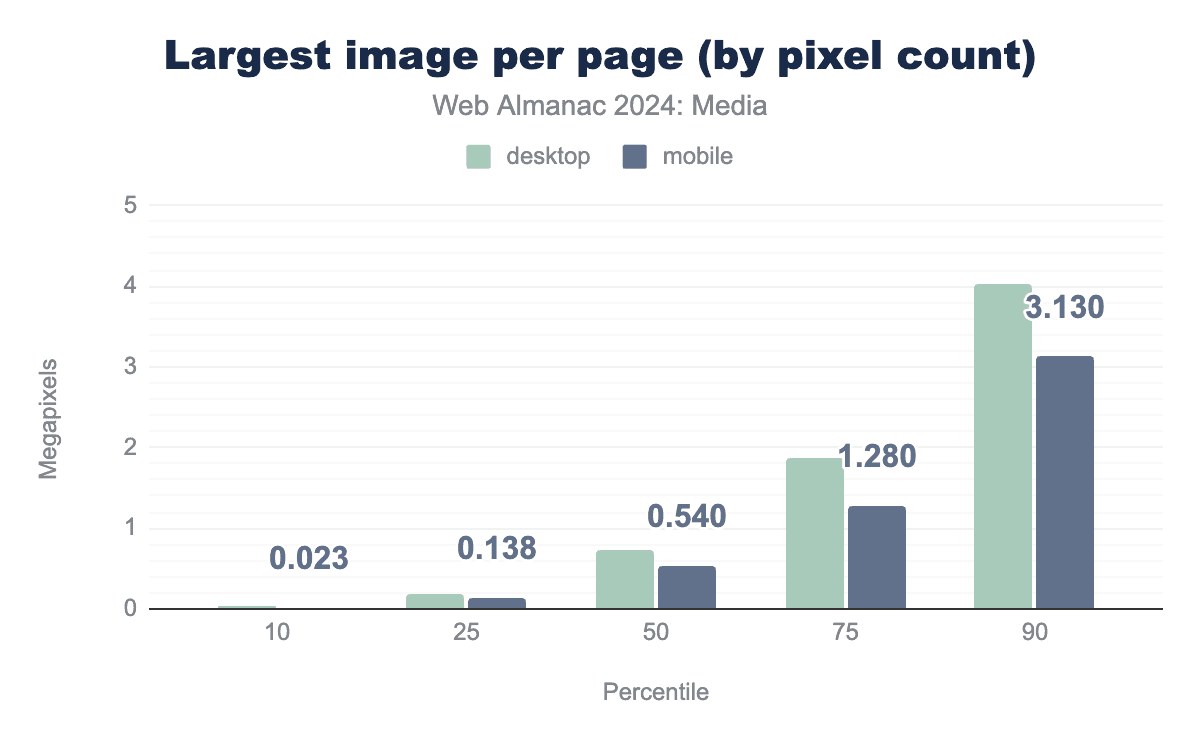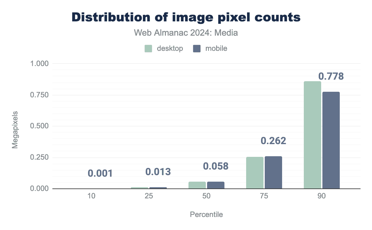 Web Almanacのモバイルクローラーはまったく成長していないにもかかわらず(360pxの幅のビューポートで、デバイスピクセル比3xでページをレンダリング)、0.058メガピクセルの中央値の画像は、前回調査した時よりも約25%大きくなっています。参考までに、正方形のアスペクト比では、0.058メガピクセルは約240×240になります。