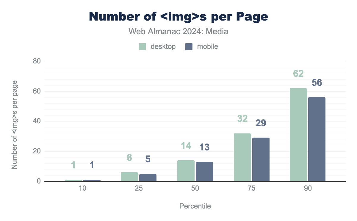 モバイルページの中央値は13個の<img>要素を含んでいます。そして90パーセンタイルでも、ページは「わずか」56個の<img>しか含んでいません。今日のウェブのビジュアル的な性質を考えると、これは妥当なようです。