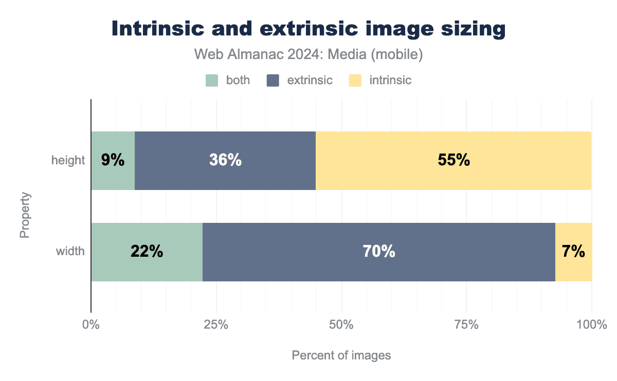 大多数の画像は外在的な幅と内在的な高さを持っています。幅の「両方」カテゴリ—max-widthまたはmin-widthのサイジング制約を持つ画像を表す—もかなり人気があります。画像を内在的な幅のままにしておくことははるかに人気が低く、2022年よりもわずかに人気が低くなっています。