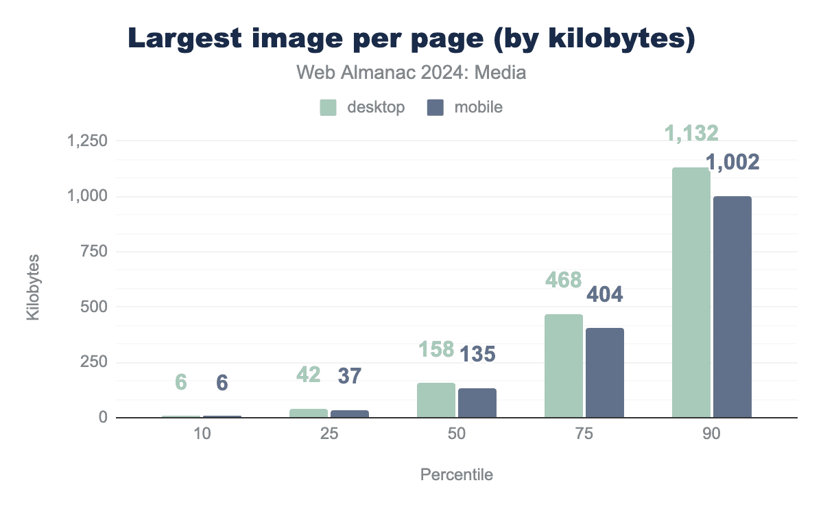 ほとんどのモバイルページには、135 KB以上の画像が1つあります。これは2022年以降8%の増加です。そして分布の上位に行くほど、加速しています:75パーセンタイルは10%増加し、90パーセンタイルは13%増加(ほぼ正確に1メガバイト)しています。