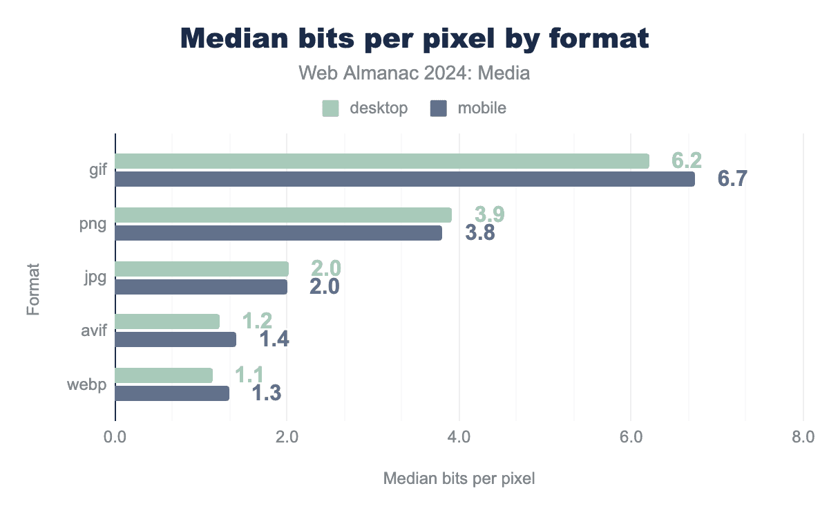 ウェブ上のJPEG、PNG、GIFのほとんどすべては、最新のフォーマットを使用したほうが良いでしょう。WebPは良いですが、AVIFとJPEG XLはさらに優れています。ウェブ上のすべての画像という巨大な船が、これらのより効率的なフォーマットへとゆっくりではあるが確実に方向転換していくのは良いことです。またSVGの使用率が上昇していることも良いことです!