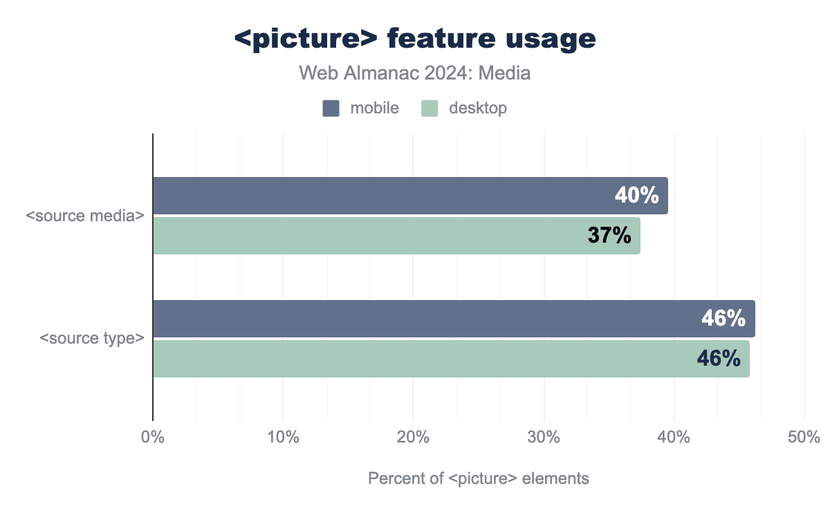 picture要素と組み合わせて、source要素上でmedia属性とtype属性を使用しているページの割合を示す棒グラフ。mediaはモバイルではpicture要素の40%、デスクトップでは37%で使用されています。typeはモバイルとデスクトップの両方でpicture要素の46%で使用されています(ただし、モバイルの棒グラフはわずかに大きくなっています)。<picture>機能の使用状況。