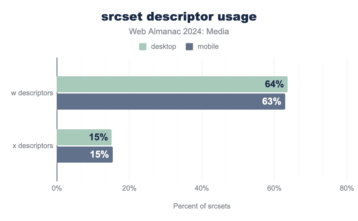x記述子とw記述子を使用しているsrcsetの割合を示す棒グラフで、モバイルとデスクトップの両方を示しています。x記述子はデスクトップとモバイルの両方でsrcsetの15%で使用されています。w記述子は4倍多く使用されており、デスクトップでは64%、モバイルでは62%の頻度で使用されています。srcset記述子の使用状況。