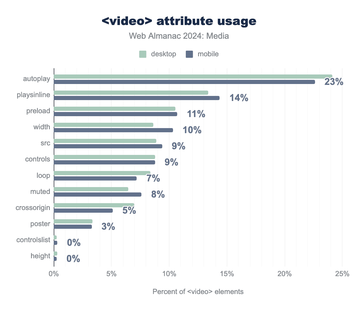 playsinlineとautoplayの両方が2022年から3パーセントポイント増加していますが—これはおそらくGIFと同じ役割を果たす短いインライン動画の採用増加を表していますが—過去数年間で最も大きく変動したのはpreloadで、その使用率は6パーセントポイント減少しています。